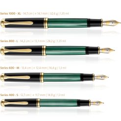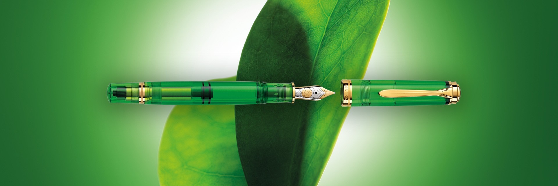 Pelikan Souverän M800 Demonstrator fountain pen with a piston filling mechanism in green-colored resin, a translucent body, and an 18k gold nib plated with rhodium.